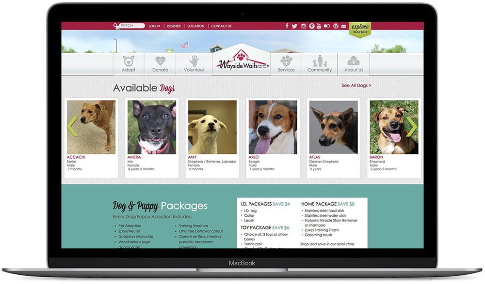 Fully custom pet listing display with search functionality and separate pages for each animal for easy social sharing.